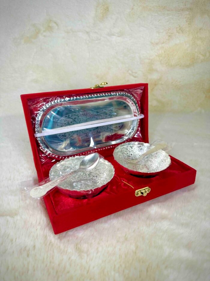 Make your celebrations extra special with this beautifully crafted 5 Pcs Premium Bowl & Plate Gift Set. Designed to impress, this elegant set includes intricately detailed bowls and a matching plate, perfect for serving dry fruits, sweets, or as a luxurious decorative piece. Packed in a stylish gift box, it?s the ideal gift for weddings, festivals, anniversaries, and housewarmings.