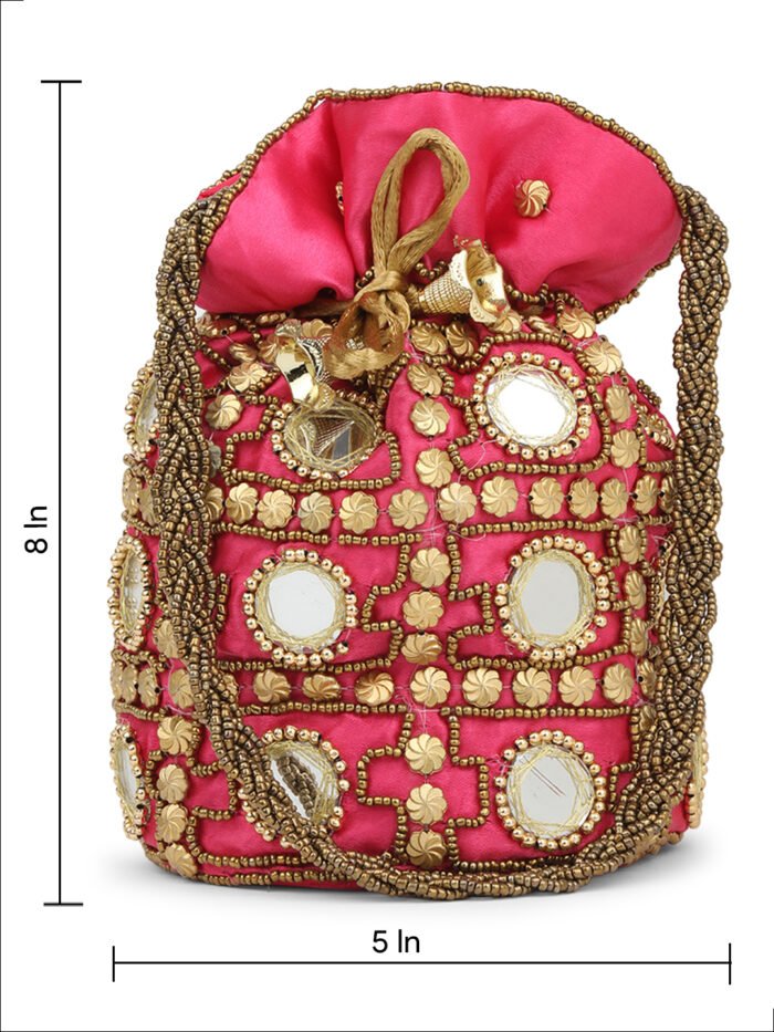 This product is a combo of tow Embellished potli bags having wrist loop 1 main compartment each with drawstring closure. Size & Fit Size of each potli bag : 9 x 9 x 3 Inch (Length x Width x Depth ) Material & Care Fabric Wipe with clean, dry cloth