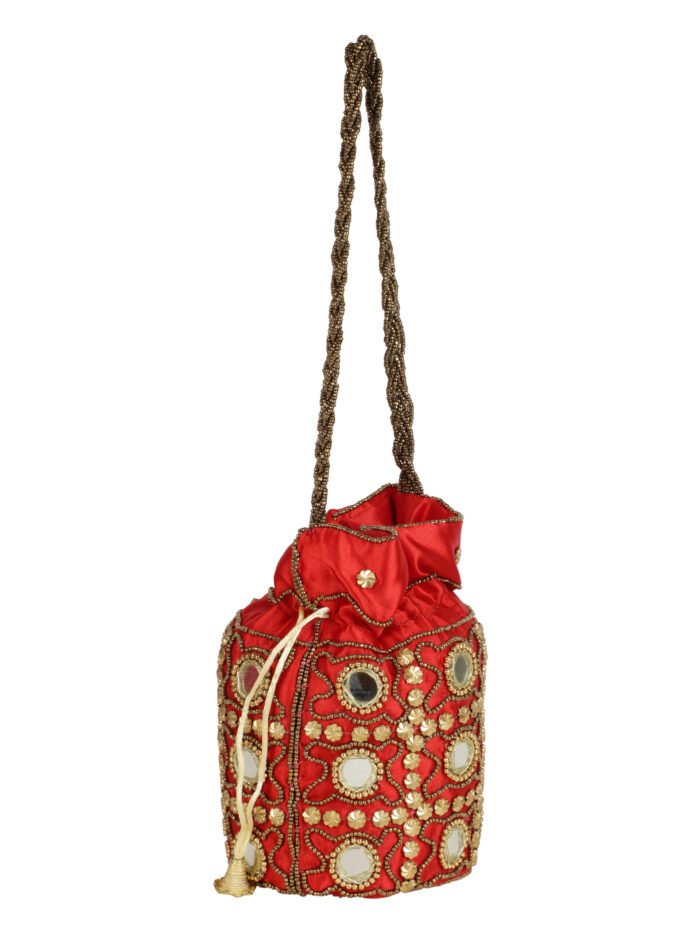 Red and gold-toned embroidered potli clutches Has wrist loop 1 main compartment with drawstring closure Size & Fit Height: Width: