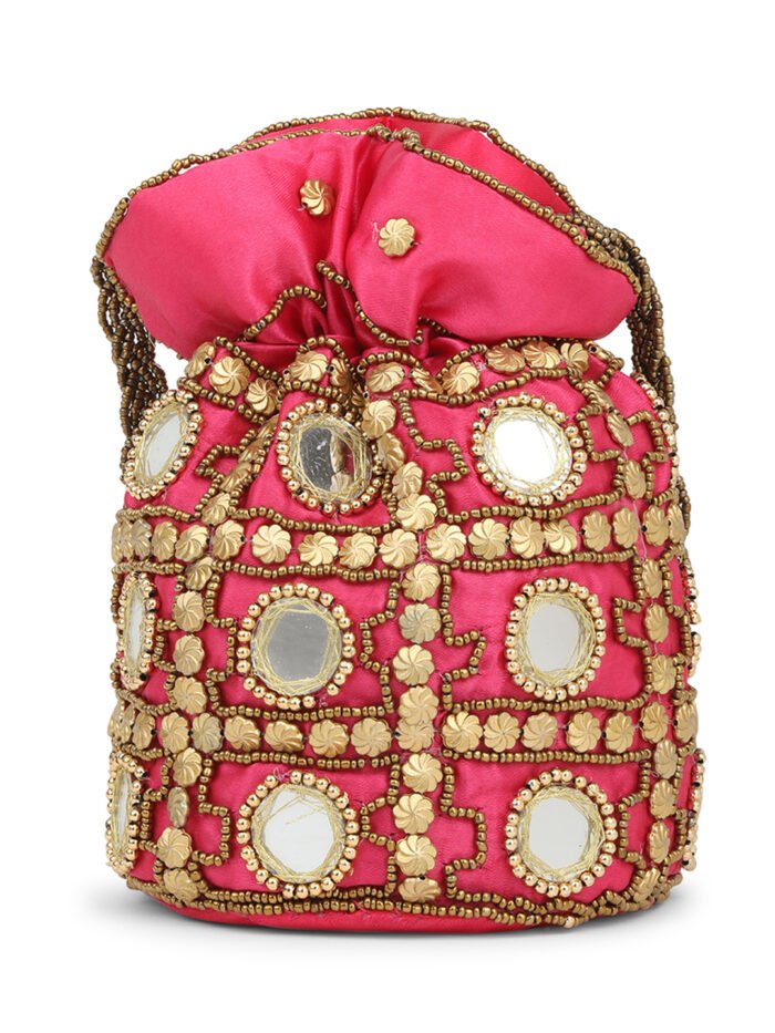 Golden embellished potli Has wrist loop 1 main compartment with drawstring closure Size & Fit Size : 9 x 9