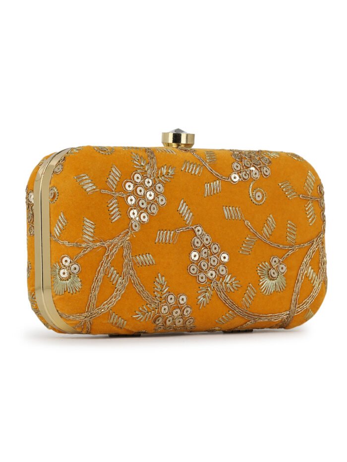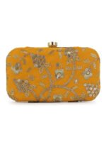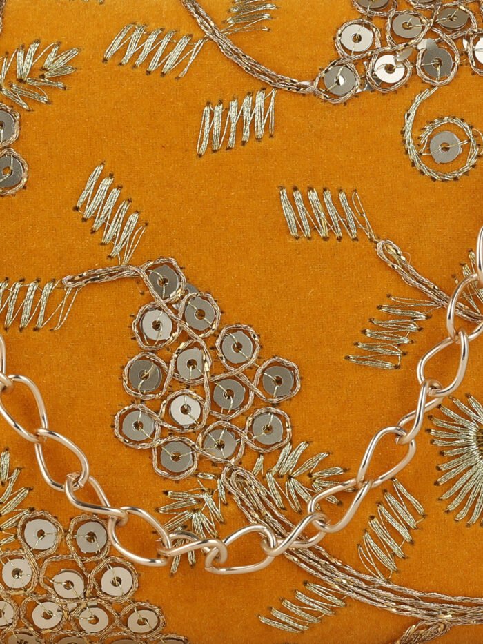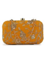 Mustard Embroidered Box clutches, Has gold chain shoulder strap, 1 main compartment with twist closure