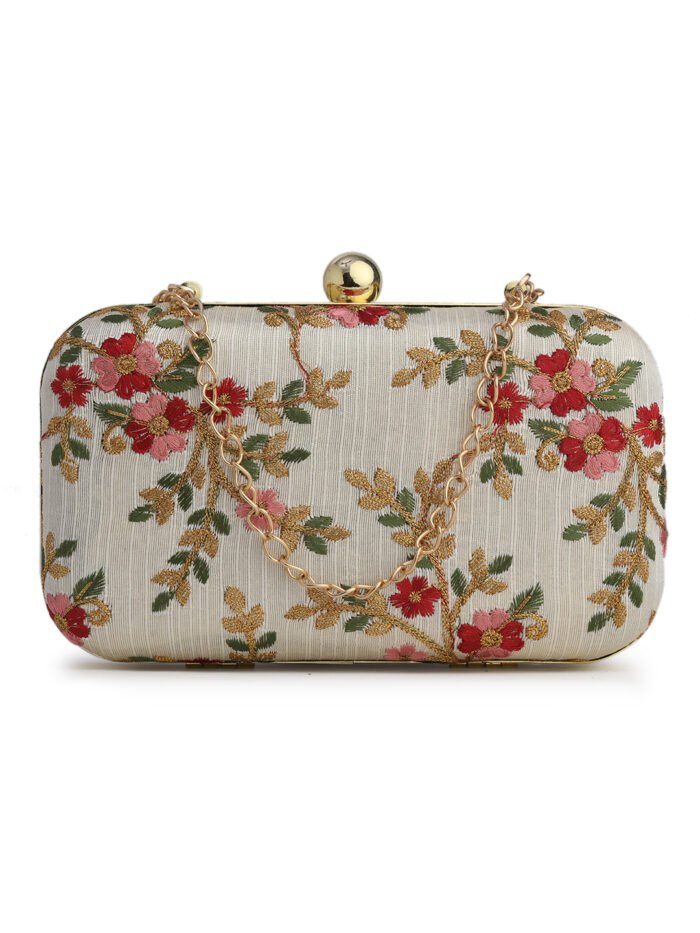 Off White & Gold Embroidered Box Clutches For Girls and womens(Multicolor)