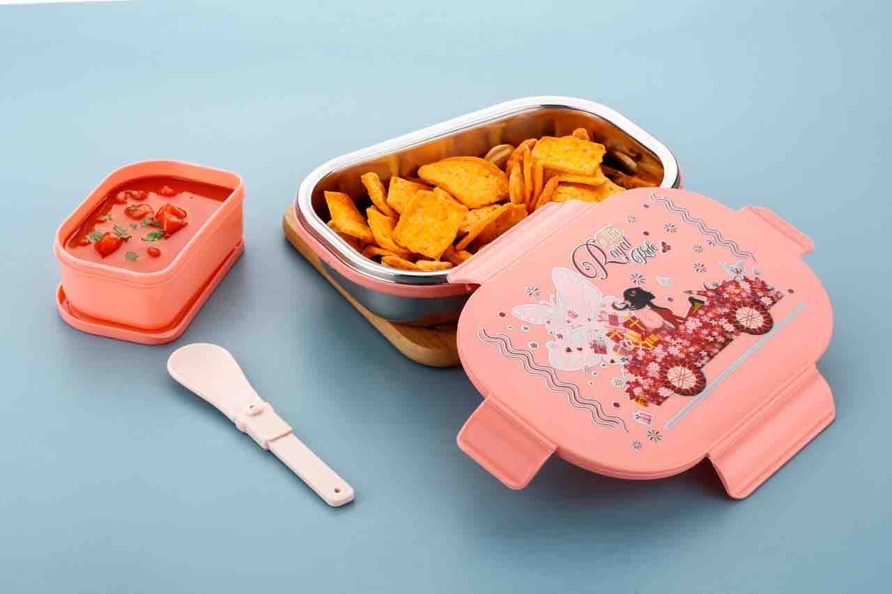 The Printed Bite Buddy Stainless Steel Lunch Box offers a stylish and practical solution for carrying meals. Its eye-catching printed design adds a touch of personality, while the robust stainless steel construction guarantees longevity. Whether you’re heading to work, school, or a picnic, this lunch box keeps your food safe and fresh.