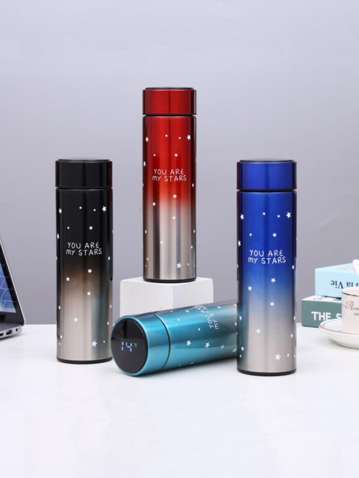 The Printed Space Star Temperature Bottle combines futuristic style with smart functionality. Featuring a cosmic-themed print and digital temperature display, this stainless steel bottle keeps your drinks hot or cold while adding a fun, trendy touch.